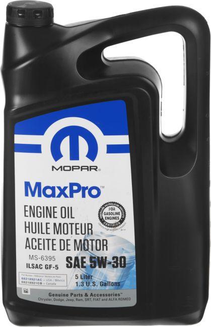 Mopar MOPAR MaxPro SAE 5W-30 Engine Oil SP/GF-6A - Високоякісне моторне масло з хорошими експлуатаційними характеристиками, розроблено спеціально для використання в сучасних бензинових двигунах автомобілів DODGE, CHRYSLER, JEEP, в тому числі оснащених каталізатором, де виробником автомобіля наказано використовувати масло з в'язкістю по SAE 5w-30 зі специфікацією MS-6395. При виборі моторного масла керуйтеся книгою з експлуатації автомобілем. Масло Mopar MaxPro SAE 5W-30 забезпечить хороший захист двигуна від зносу і корозії. Запобіжить утворенню високотемпературних відкладень на деталях двигуна. Регулярне застосування і своєчасна заміна моторного масла Mopar MaxPro SAE 5W-30 продовжить термін служби двигуна.